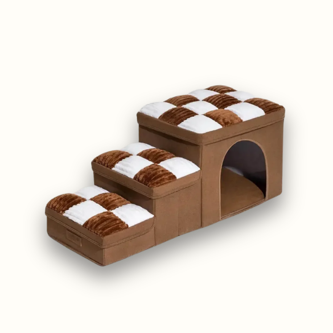 Heeft je viervoeter moeite met op bed of de bank klimmen? De CozyClimb biedt een zachte, veilige trap met verborgen opbergruimte en een knusse rustplek.